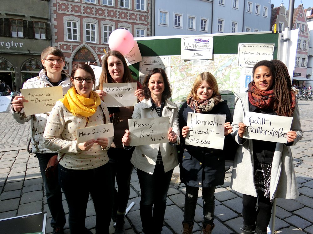 "In Landshut gibt es ungefähr 265 Straßen, die nach Männern benannt sind. Nur 25 dagegen tragen weibliche Namen, das sind nicht einmal 10 Prozent. Dabei gibt es eine große Anzahl verdienstvoller Frauen, die diese Ehrung verdient hätten. Wir finden, es ist an der Zeit den Frauen endlich auch im öffentlichen Raum den Platz einzuräumen, den sie längst verdient hätten. Viele BürgerInnen waren an unserem Infostand in der Altstadt entsetzt über diese Zahlen und innerhalb kürzester Zeit wurden viele Vorschläge für "weibliche" Straßennamen gesammelt. Wir freuen uns, dass die Landesvorsitzende der Bayerischen Grünen Sigi Hagl unsere Aktion unterstützte".