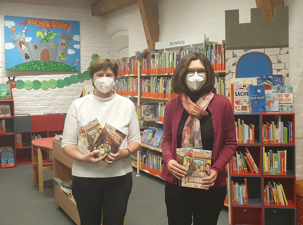 Auf dem Foto: Landtagsabgeordnete Rosi Steinberger (links) und Monika Steurer, Leiterin der Stadtbücherei bei der Buchübergabe.