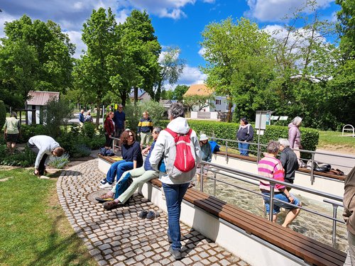 Frisch gestärkt zeigte der selbsternannte Stadtführer Tuscher seinen ParteikollegInnen Bekanntes und Unbekanntes von seiner Heimatstadt. Sein besonderes Augenmerk lag auf Inspirationen für Kumhausen, so ging es von der Gillamooswiese als erstes zum „Schwefelschwammerl“, der Abensberger Kneipanlage. Historisches erfuhr die Gruppe dann auf dem Weg über die Liebesinsel zur Burg und weiter zur Aventinusstatue. Der Stadtmauer entlang wurde moderne Kunst an alten Gemäuern bewundert. So hatte die Gruppe getreu dem Motto, Ökologisches gesehen, kulinarisch geschlemmt, Historisches gelernt und Freundschaften vertieft.