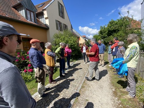 Mit Fahrgemeinschaften fuhr die Gruppe von 27 Personen erstmal zum alten „Ökodorf Gaden“ bei Abensberg. Für dieses wegweisende Projekt bekam die „Ökodorf GmbH“ 1995 den bayerischen Umweltpreis. Schon vor 30 Jahren wurde hier auf eine ökologische Bauweise geachtet und ein Nahwärmenetz installiert, welches durch die Holzabfälle der nebenstehenden Massivholzschreinerei gespeist wird. Durch eine große Tiefgarage wurde eine Verkehrsfreiheit erreicht und somit viel Platz für Kinder und gemeinsame Aktivitäten wie Grillen, Weihnachtsmarkt u.v.m. geschaffen. Beeindruckend war die spontane Führung eines Bewohners in das Innere des Mehrfamilienhauses mit einer spürbaren Wohlfühlatmosphäre. Interessante Beiträge kamen auch von den Vertretern der Abensberger Grünen, die die Kumhausener Delegation begleiteten. Voll mit neuen Eindrücken und Ideen für eigene Bebauungspläne ging es nach Sandharlanden. Hungrig gemacht durch ein Spargelseminar, bei dem der Weg vom Setzen der Pflanze, über die Hege, das Stechen, Waschen, Sortieren, … bis zum Topf anschaulich erklärt wurde, genossen die Teilnehmer den frisch gestochenen Spargel.