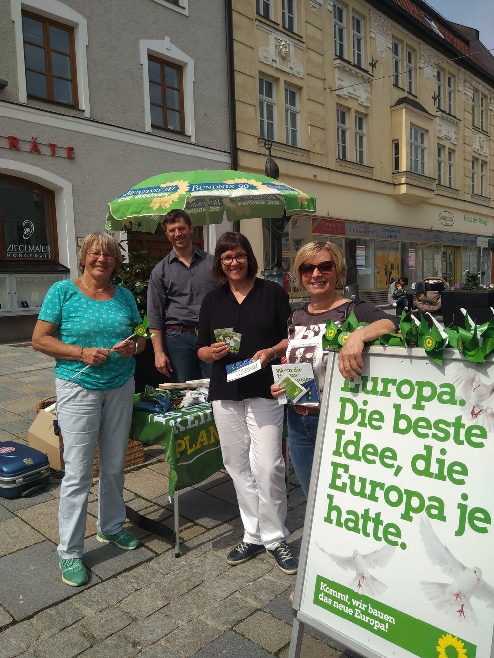 Die Grünen aus der Stadt Vilsbiburg informierten an den Samstagen vor der Europawahl über die grünen Ziele, die Kandidat*innen und das grüne Wahlprogramm. Der Stand an dem wie immer gut besuchten Wochenmarkt auf dem Stadtplatz ist ein gerne genutzer Treffpunkt für Menschen, die lieber Herz statt Hetze zeigen.