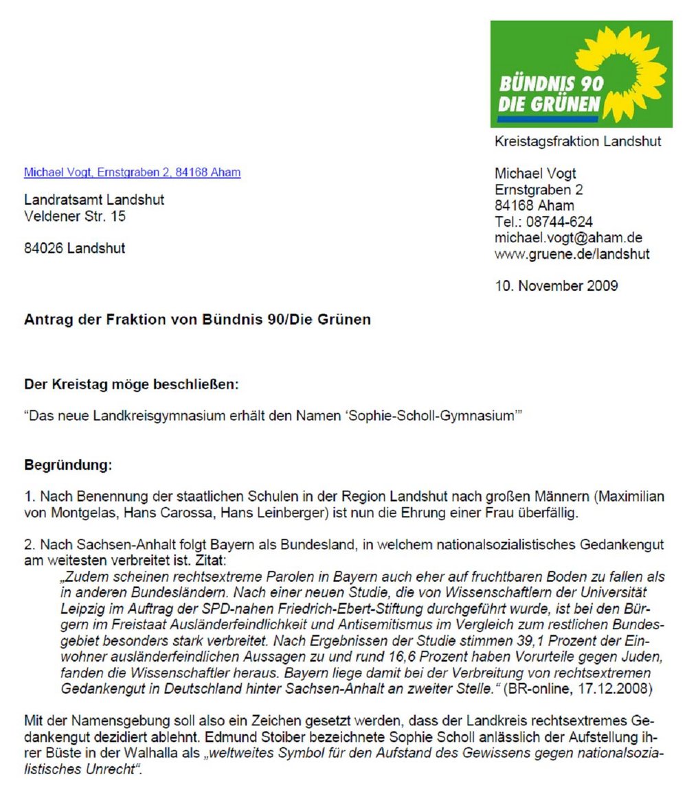 Vogt erinnerte daran, dass die Fraktion vor genau zwei Jahren den Antrag gestellt habe, das neue Gymnasium nach Sophie Scholl zu benennen. Damit solle der Landkreis ein Zeichen setzen, dass man rechtsextremes Gedankengut ablehne. Die grüne Fraktion war der Ansicht, dass dieser Antrag angesichts der Aufdeckung einer rechten Terrorzelle aktueller denn je sei.