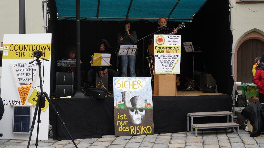 Am vergangenen Samstag trafen sich engagierte Bürger gleich zwei Mal in Landshut. Vor der abendlichen Lichterkette gegen Rechts fand mittags die fünfte Count down Veranstaltung gegen das Atomkraftwerk Isar 1 statt. Diese Demonstrationen gibt es einmal im Monat bis zum eigentlichen Abschalttermin im Juni. Am 4. Juni finden die Demonstrationen ihren Höhepunkt in einer Umzingelung der Atommeiler in Ohu. Das Bündnis für Atomausstieg Landshut konnte am Samstag die beiden Redner Dr. Thomas Gambke und Richard Mergner begrüßen. Thomas Gambke ist Bundestagsabgeordneter der Grünen und sprach über die Klage vor dem Verfassungsgericht, die die Laufzeitverlängerung der deutschen AKWs zum Inhalt hat. „Ich bin zuversichtlich, dass wir die Verlängerung der Laufzeiten für Atomkraftwerke dadurch verhindern können. Wir werden nicht hinnehmen, dass die Bundesregierung gegen den Willen der Bevölkerung ein Gesetz verabschiedet, das noch dazu verfassungswidrig ist“, sagte Gambke unter großem Beifall. Der zweite Redner war Richard Mergner, der Landesbeauftragte des Bund Naturschutz in Bayern. Die Musik kam von den Los Globos und zum Abschluss sang Armin Reiseck das Lied vom Abschalten mit dem Titel „Wir sind doch nicht blöd.“