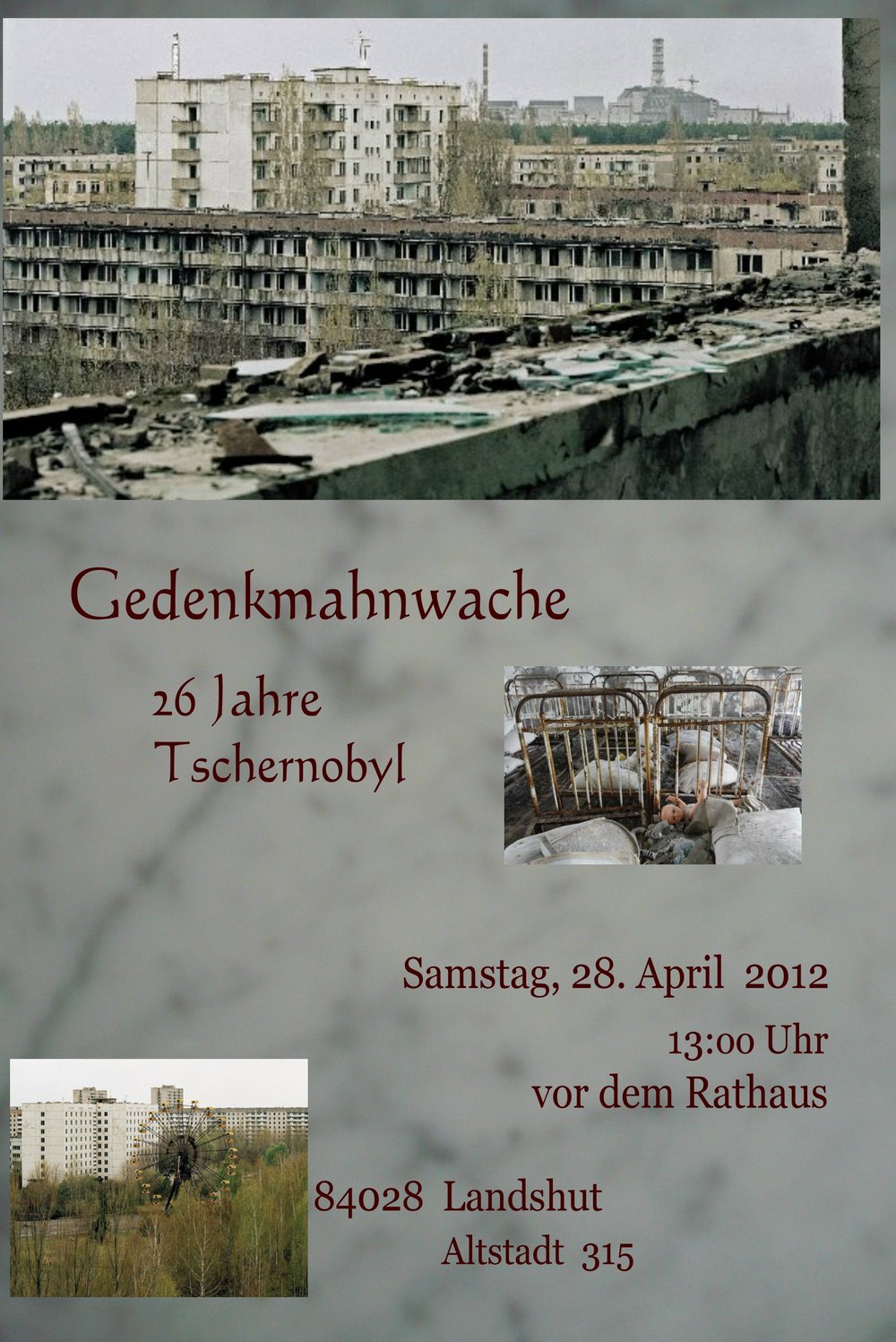 Am kommenden Samstag wird es um 13.00 Uhr am Dreifaltigkeitsplatz in Landshut eine Mahnwache zum Gedenken an die Tschernobyl-Katastrophe vor 26 Jahren geben. Noch heute leiden viele Opfer dieses Atomunfalls an den Folgen, nun inzwischen schon in der zweiten Generation. Bei der Mahnwache wird natürlich auch der Opfer in Fukushima gedacht und daran erinnert, dass in Temelin ein Ausbau der dortigen Reaktoren geplant ist. Aber auch hier vor Ort ist mit dem Abschalten von Isar 1 noch lange nicht alle Gefahr gebannt. Die Pläne zur Errichtung einer Schutzmauer um das Zwischenlager sprechen eine eindeutige Sprache. Die Grünen aus Stadt und Landkreis nehmen an dieser Mahnwache teil und hoffen auf rege Beteiligung.