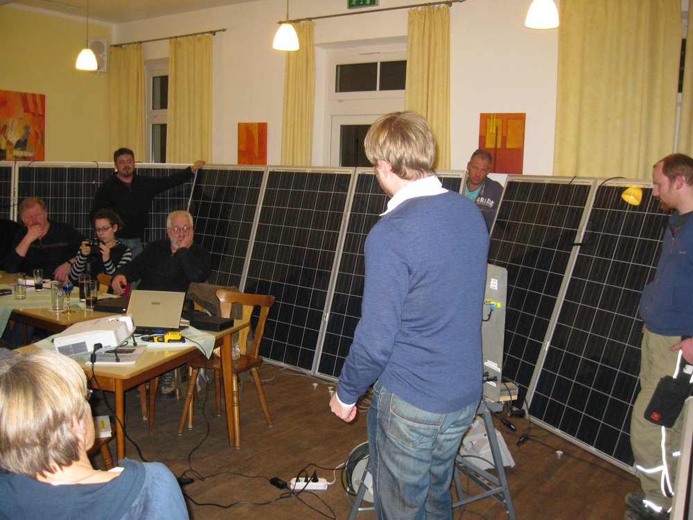 Dass jedoch auch bei Nacht durch das Licht des Mondes, die Einsatzscheinwerfer der Feuerwehren oder durch das Licht des Brandes sich eine gefährliche Spannung aufbauen kann, ist ein Märchen. Mit einer großen Versuchsanlage aus neun Photovoltaikmodulen mit entsprechender Beleuchtung und umfangreicher Messtechnik wies Rolf Fahle von der solar GmbH aus Furth bei Landshut nach, dass keine dieser Beleuchtungsquellen in der Lage sind, einen entsprechenden Stromfluss zu erzeugen.