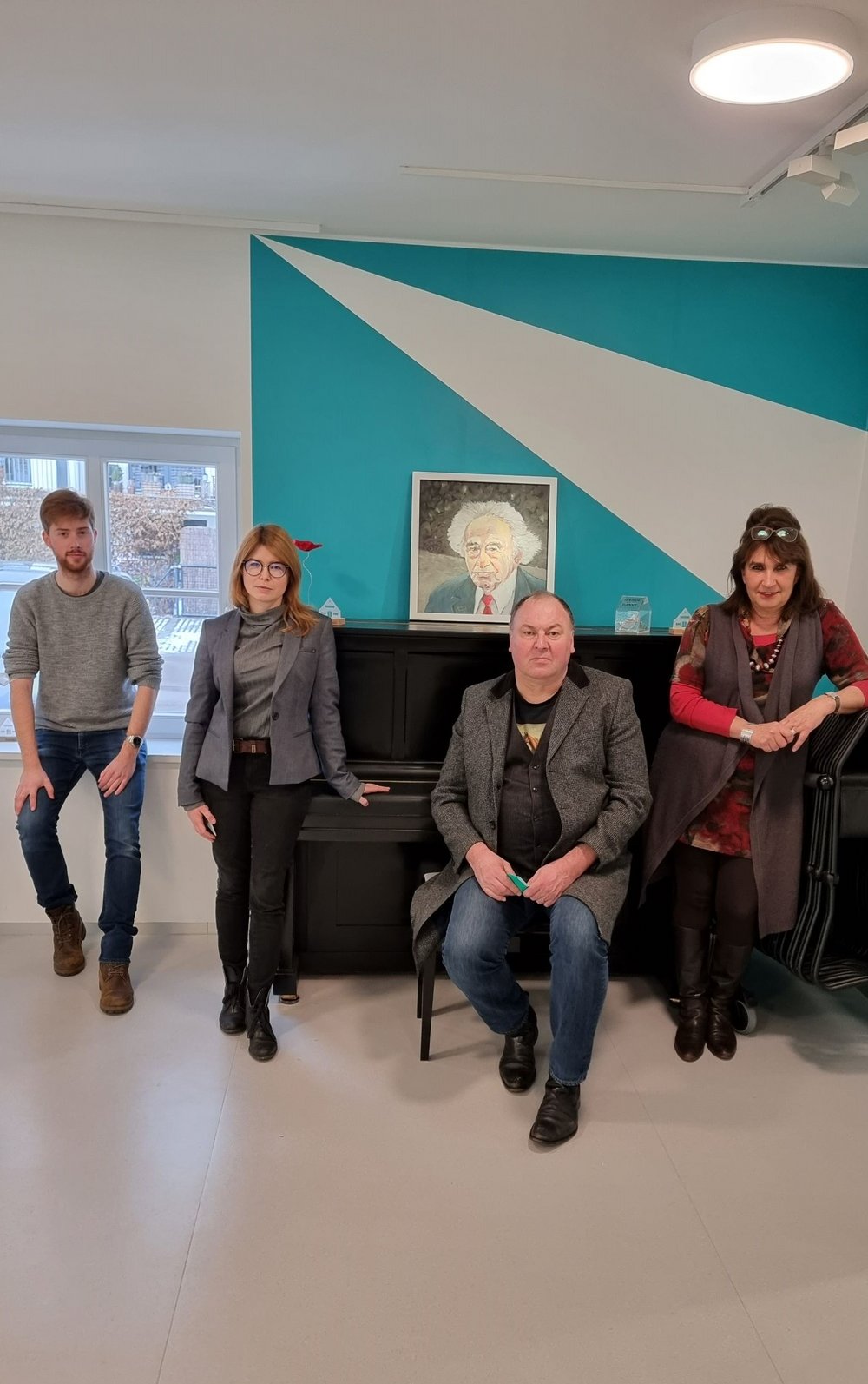 Bildunterschrift: Die Leiterin des Museums „Erinnerungsort BADEHAUS“, Frau Dr. Sybille Krafft (rechts), zusammen mit dem 1. stellvertretenden Vereinsvorstand Jonathan Coenen (links) und den beiden Grünen Bundestagsabgeordneten Marlene Schönberger und Erhard Grundl im Max-Mannheimer-Forum des Erinnerungsortes.