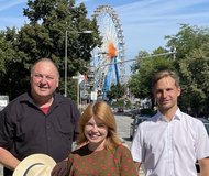 Foto: Die drei Grünen Abgeordneten aus Niederbayern (v.l. Erhard Grundl MdB, Marlene Schönberger MdB und Toni Schuberl MdL) besuchen nach dem „Volksfest-Gespräch“ das Gäubodenfest.